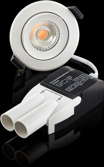 Downlight godkänd för montage direkt i isolering. Färdigkopplad med fasdimringsbart drivdon för anslutningen direkt till 230V. Med snabbplint och verktygslös dragavlastning för både kabel och dubbla VP 16 flexrör. Finish i mattvit RAL9003. LED 4,5W, total förbrukning 5,5W. Armaturen är IP44 klassad och drivdonet IP20. Godkänd för inom och utomhusbruk.
