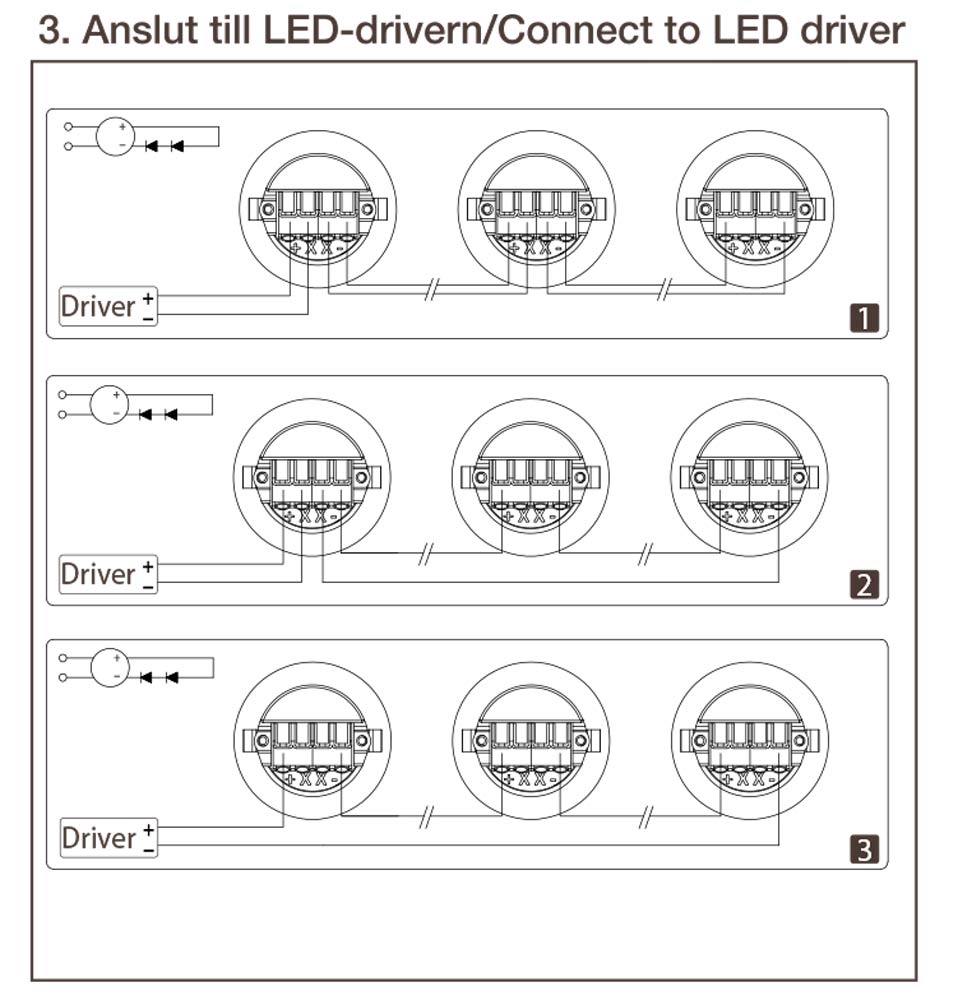 Installation: Lamporna skall seriekopplas till drivdon 350mA (ingår ej). Förutom de vanliga kopplingarna + och - har plinten två sammankopplade x kopplingar som kan användas för att leda tillbaka - från sista lampan till drivdonet.