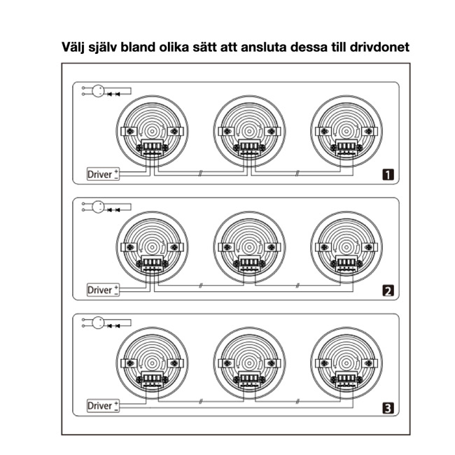 Det finns 3 olika sätt att koppla dessa lampor i serie, se pdf-fil och bild för mer information.