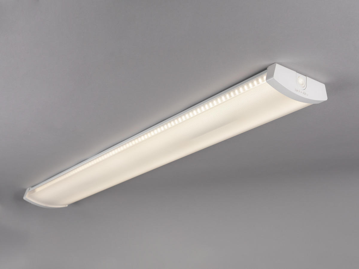 Hide-A-Lite Liteline Basic 1200S Sensor / On-Off LED. Industriarmatur IP44 i basmodell, ersätter T5- och T8-lysrörsarmaturer med lägre energiförbrukning och minskat underhåll. Armaturen har linjeprismatisk kupa i slagtålig PC med opalfilm, samt smarta patenterade fällbara gavlar.