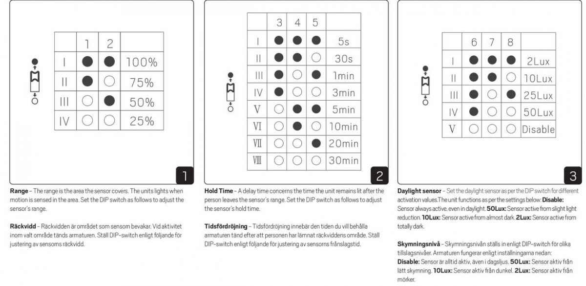 Följande är inställbart på armaturen med dip-switchar