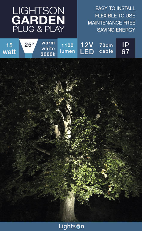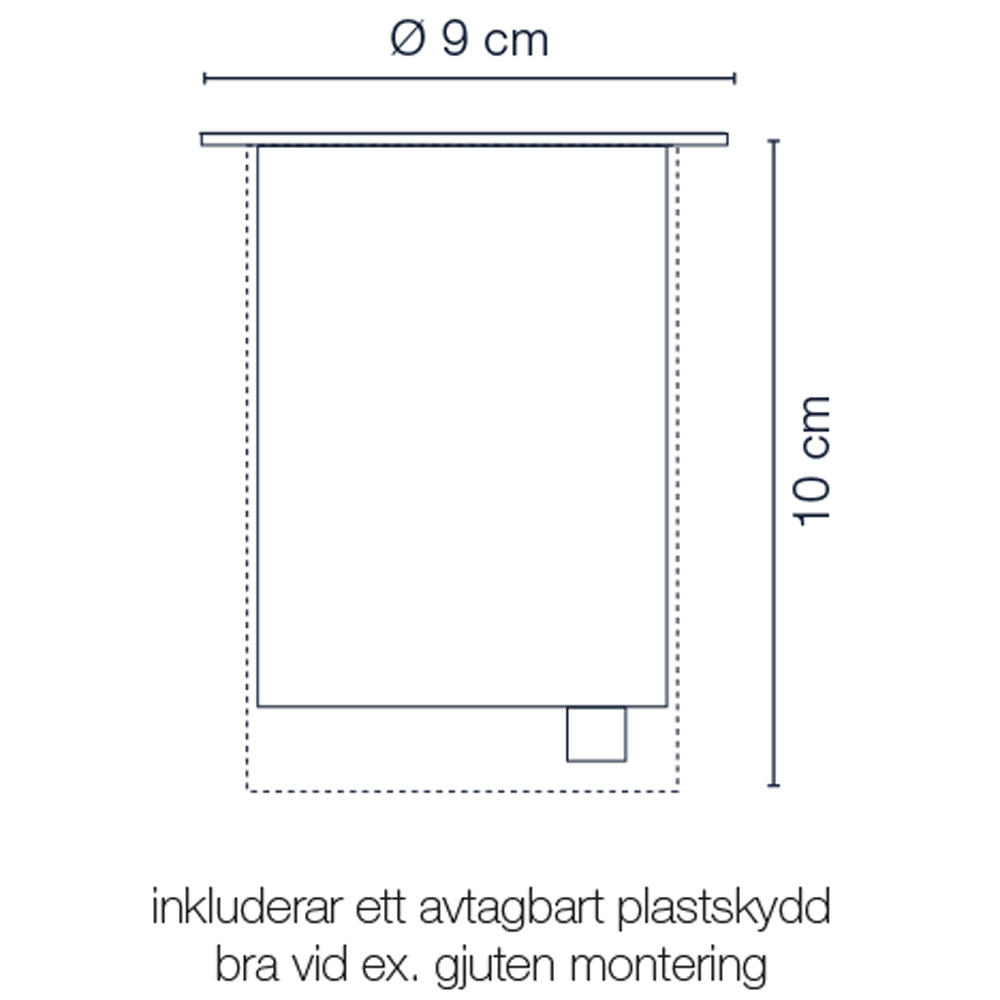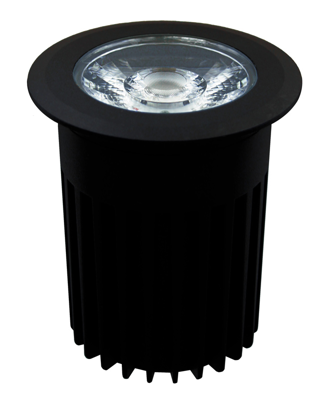 • 12 volt AC• 15 watt LED (integrerad ljuskälla)• 1200 lumen• IP67• Smal spridning på ljuset (25°)• Varmvitt ljus (3000°K)• Svart aluminium, akrylglas• Ø 9 cm diameter, 10 cm djup, se bild• 70 cm gummikabel• Plastkopp för tex gjuten montering ingår