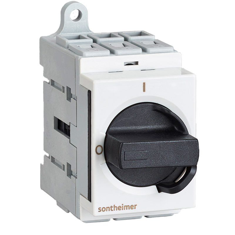 Låsbar lastfrånskiljare/huvudbrytare för normcentral. Låsbar på enkelt sätt tack vare design med ögla. 3-polig, 40A med en bredd på endast 36mm (2 moduler).