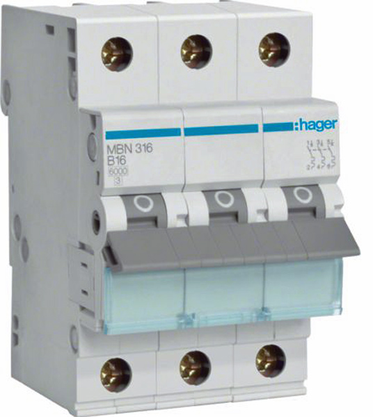 Dvärgbrytare med B-karakteristik (snabb), 6 kA brytförmåga, 1,2 och 3-polig. För pålitligt skydd av kablar och ledningar mot överlast och kortslutning används 1-3 poliga dvärgbrytare från Hager. Tillbehör är fasskena KDN363.
