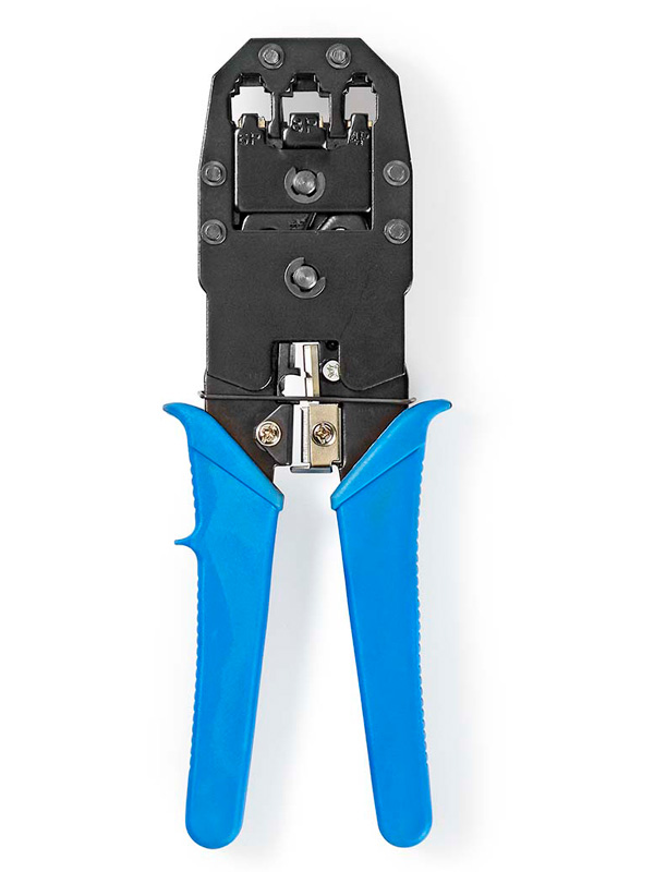 Crimptång för modulära stickproppar och för att skala isolering och kapa kablar. Inklusive flera blad för att kapa och skala kablar innan crimpning.