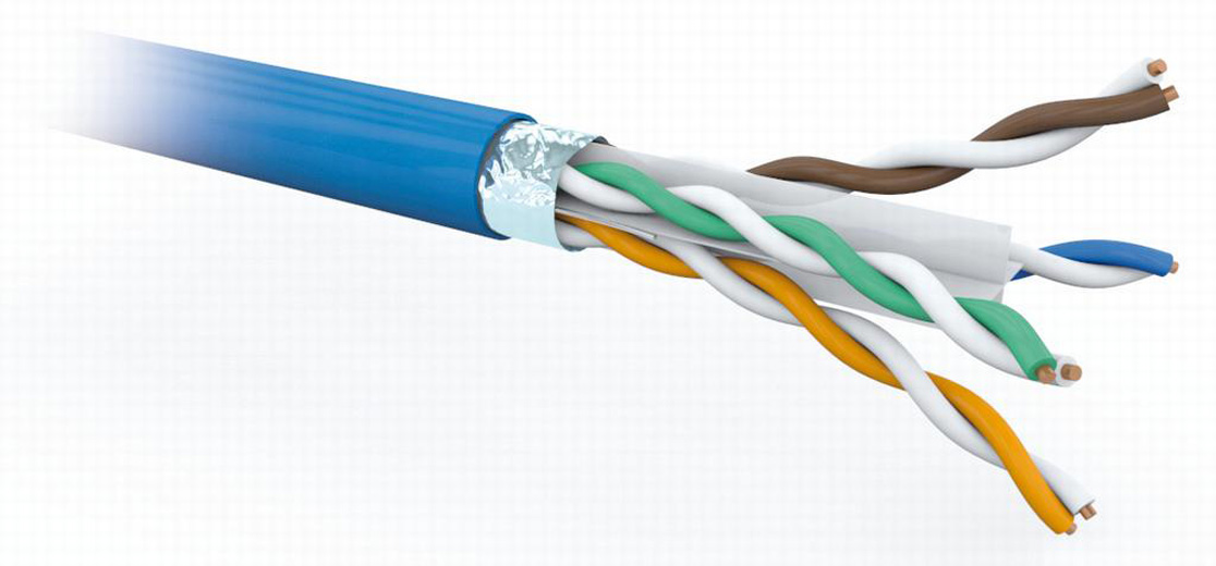 Skärmad blå halogenfri nätverkskabel kat 6. Innehåller 4 tvinnade par med PE-isolerade solida ledare AWG24, separerade med en krysskärna av plast. Mantel runt alla paren i folie.