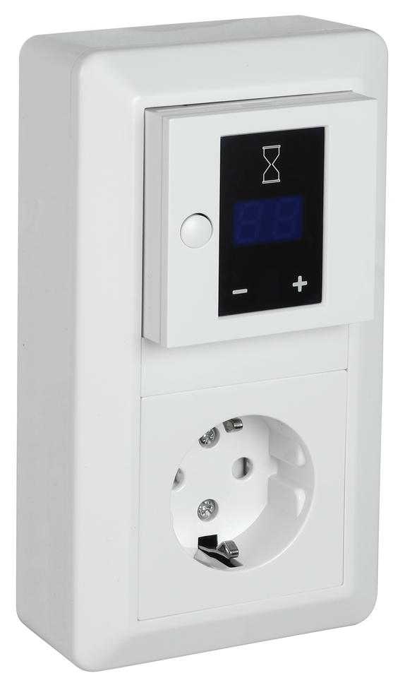 Komplett enhet med Display timer 18 879 60 och 1-vägsuttag med jord. Skruvanslutning av ledarna. För utanpåliggande montage.