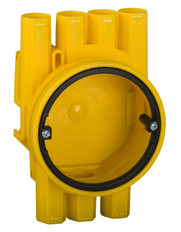 Halogenfri kopplingsdosa med stutsar placerade 26mm från dosans framkant, avsedd för dubbelskiva. Med 7st stutsar Ø 16mm. Material PE-HD.