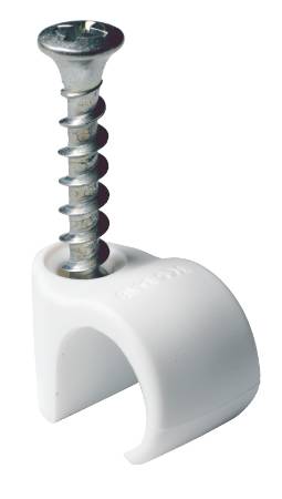 Skruvclips vit med rostfri syrafasta skruvar med korrosivitetsklass C4, clips tillverkade av slagtålig PP. För snabb installation av runda kablar och rör direkt i betong eller tegel.