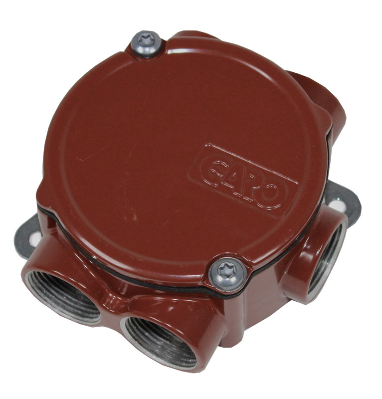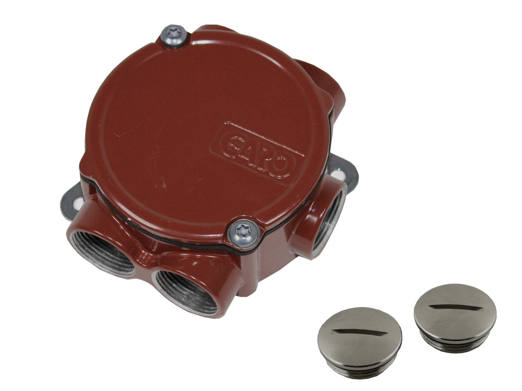 Locus 5 Röd är en kopplingsdosa i lättmetall med 5st M25 utgångar utan kopplingsplint. Dosan levereras inklusive 2st täckpluggar att täcka utgångar som inte används.