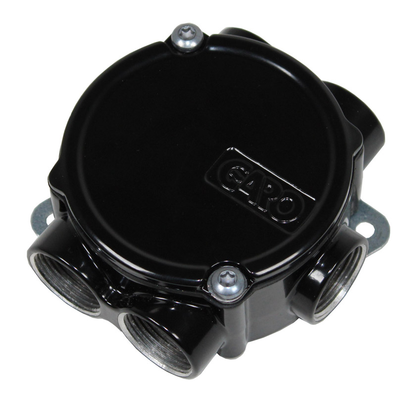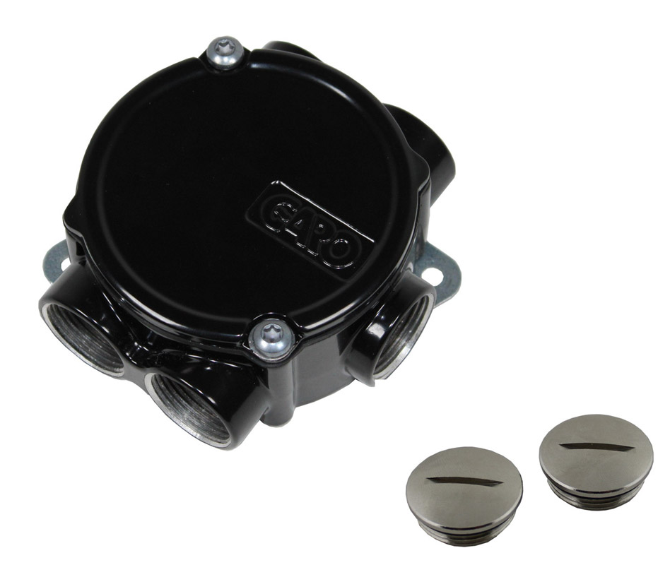 Locus 5 Svart är en kopplingsdosa i lättmetall med 5st M25 utgångar utan kopplingsplint. Dosan levereras inklusive 2st täckpluggar att täcka utgångar som inte används.