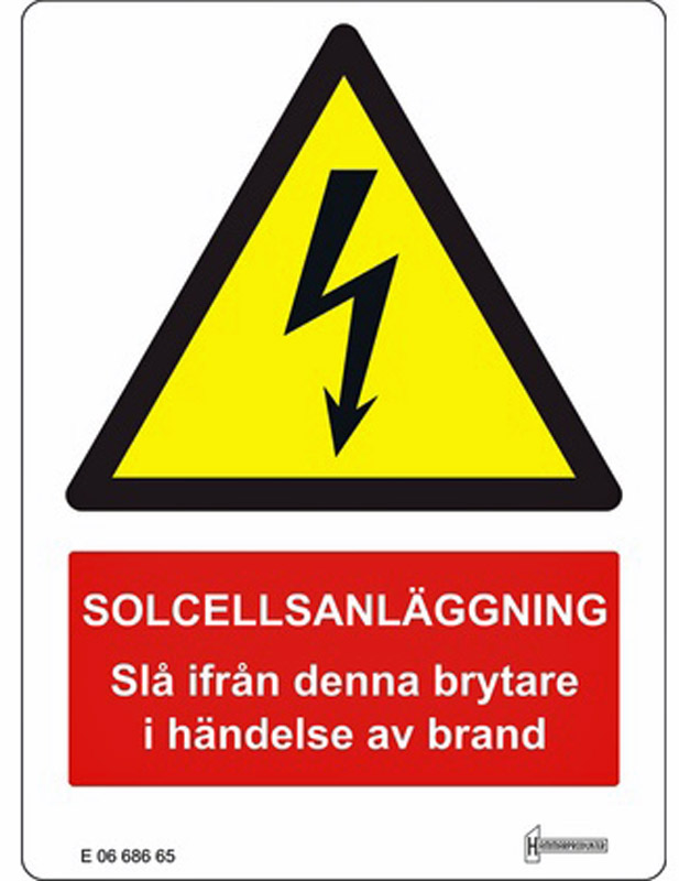 Skylt Solcellsanläggning Slå ifrån denna brytare i händelse av brand. Vit med svart, röd och gul text.