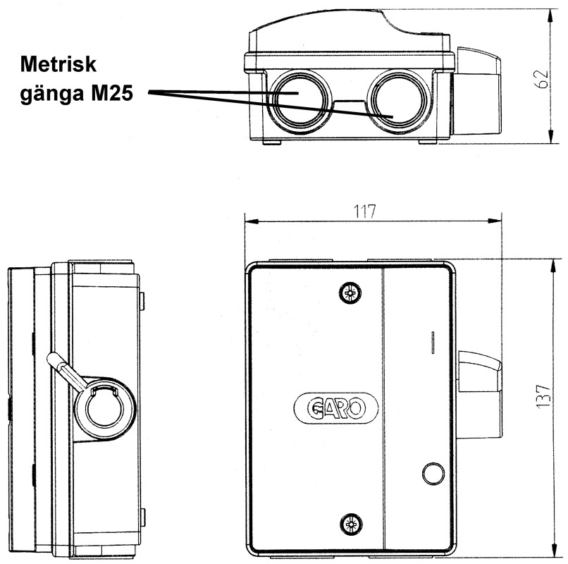 Brytarna har gängade utbrytbara hål med metrisk gänga M25. För ledningsinförning uppåt och nedåt, bra kopplingsutrymme samt en knockout i botten med diameter 21 mm.