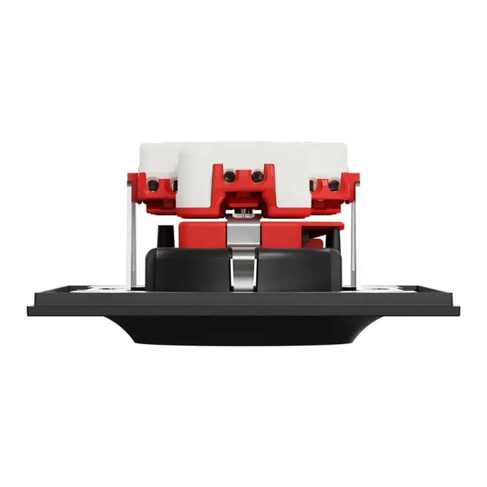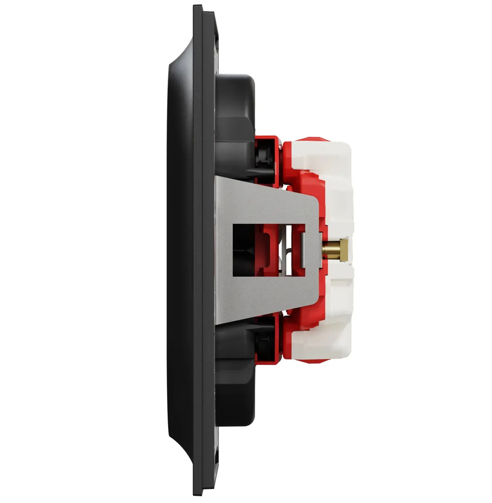 Uttaget är jordat och utrustat med snabbanslutning med trådingång från sidan för smidig och säker inkoppling. För montage krävs en 1,5-facks apparatdosa (cc 60 mm) – något som är viktigt för att den låga designen ska få plats korrekt. Produkten kan även monteras i motsvarande utanpåliggande 1,5-facks dosa vid behov.