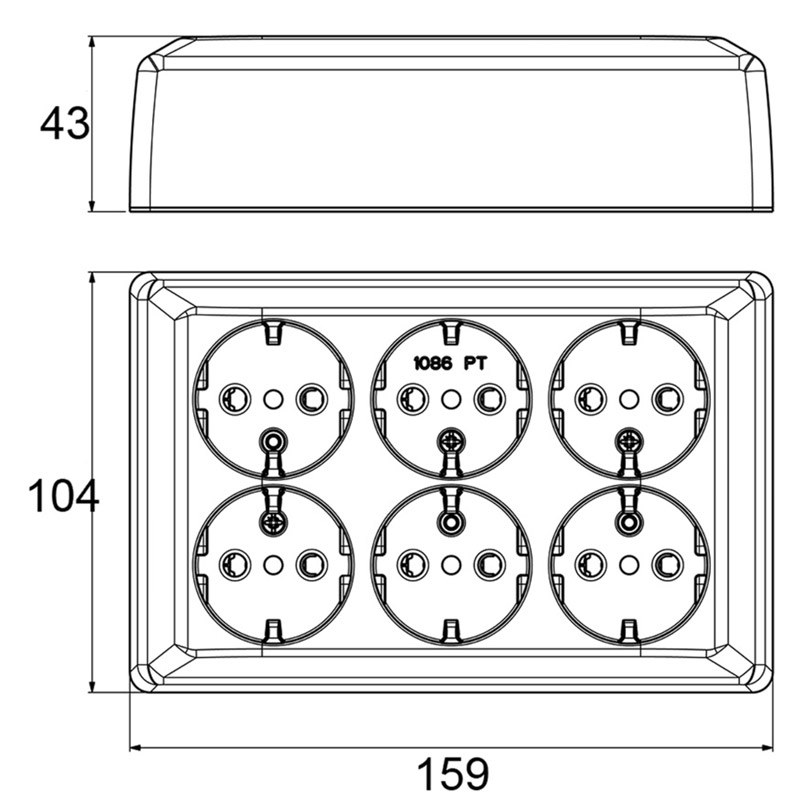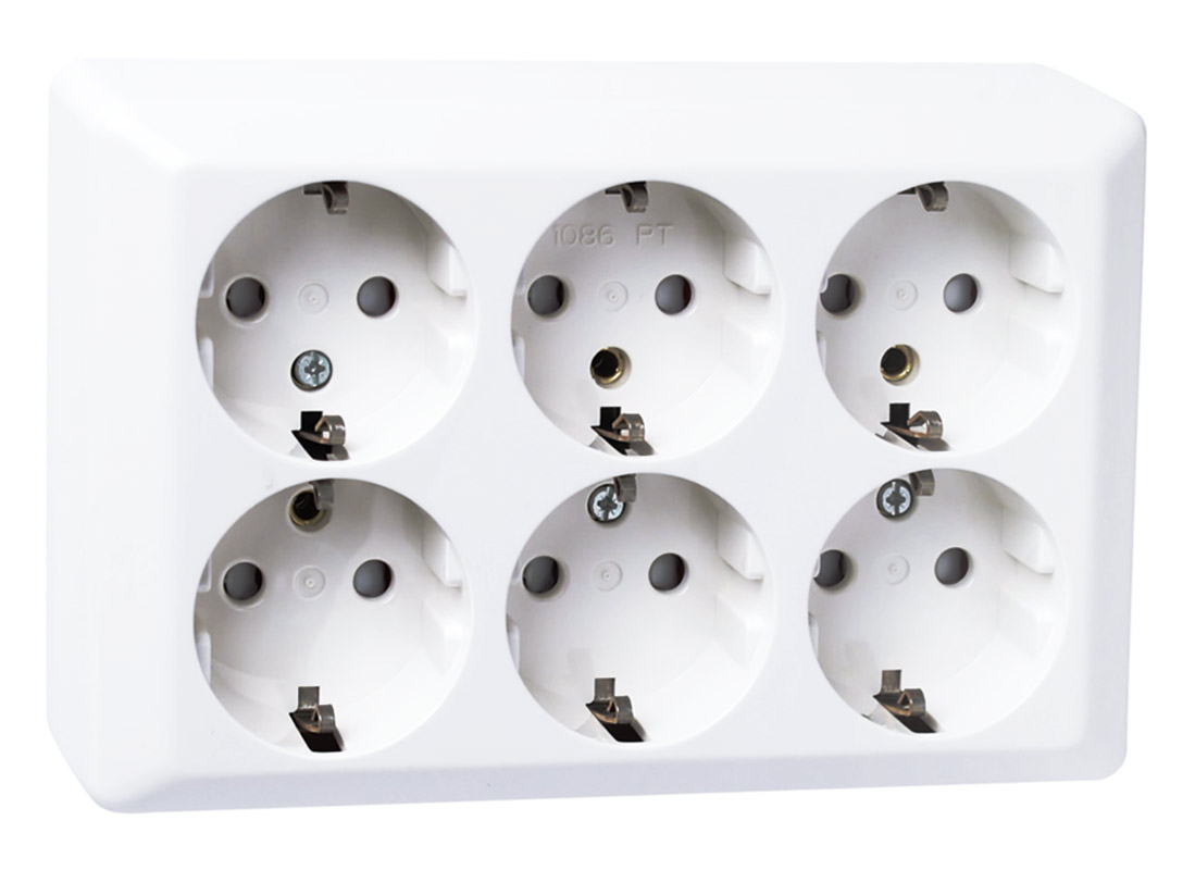 Vägguttag med 6 st Schukouttag och bottenplatta av halogenfri termoplast. Bottenplattan har nyckelhål med "knock-outs" för montage på apparatdosa. Skruvanslutning av ledarna. Dubbla anslutningar per fas.