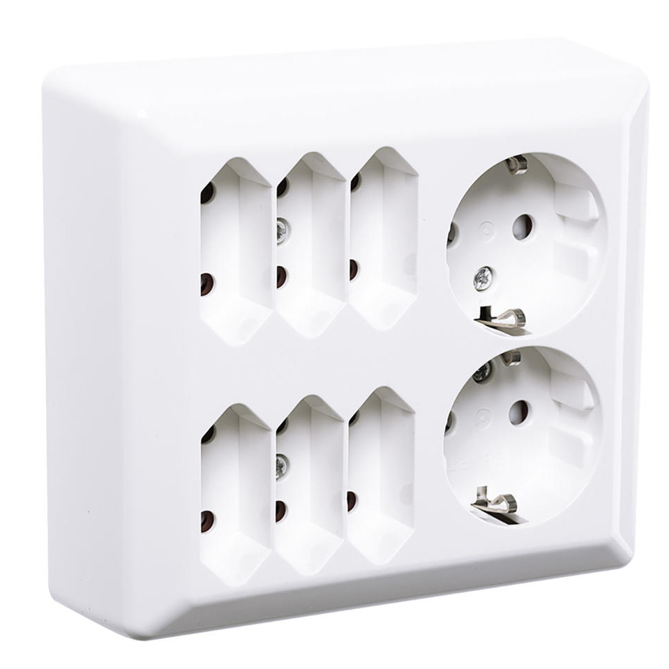 Vägguttag 6 "Euro"+ 2 Schuko uttag för utanpåliggande montage. Sockel, lock och bottenplatta av halogenfri termoplast. Skruvanslutning av ledarna. Dubbla anslutningar per fas. För montage på dosa eller direkt på vägg. Två av uttagsbrunnarna kan styras via strömställare.