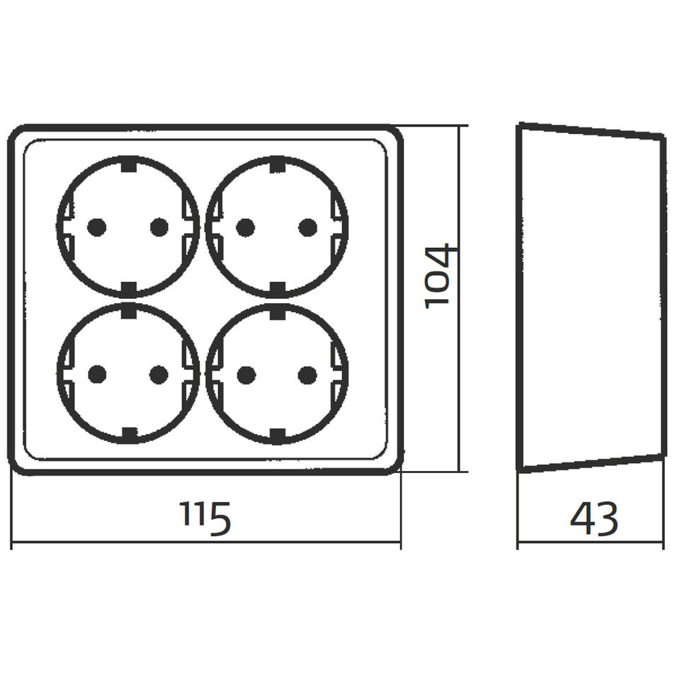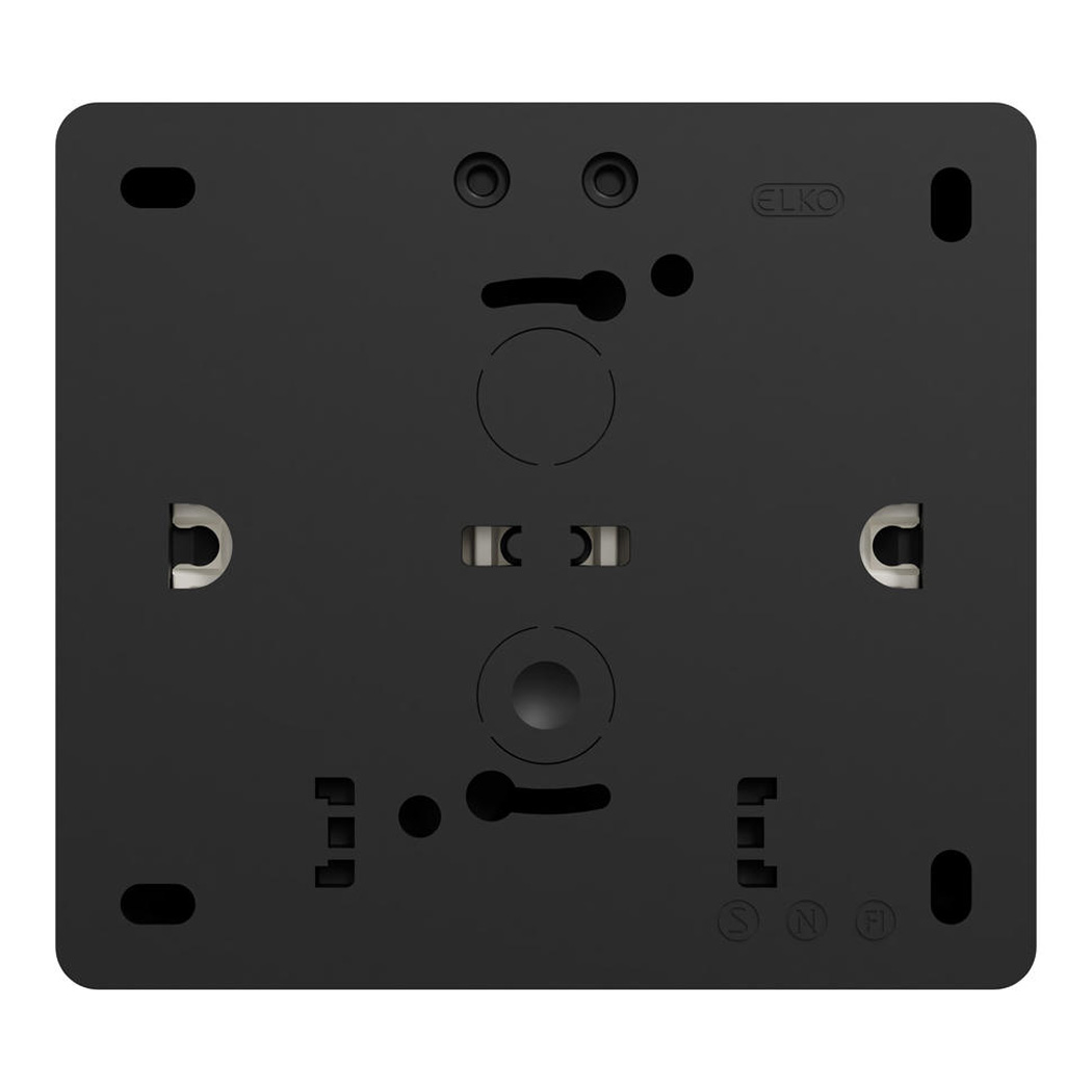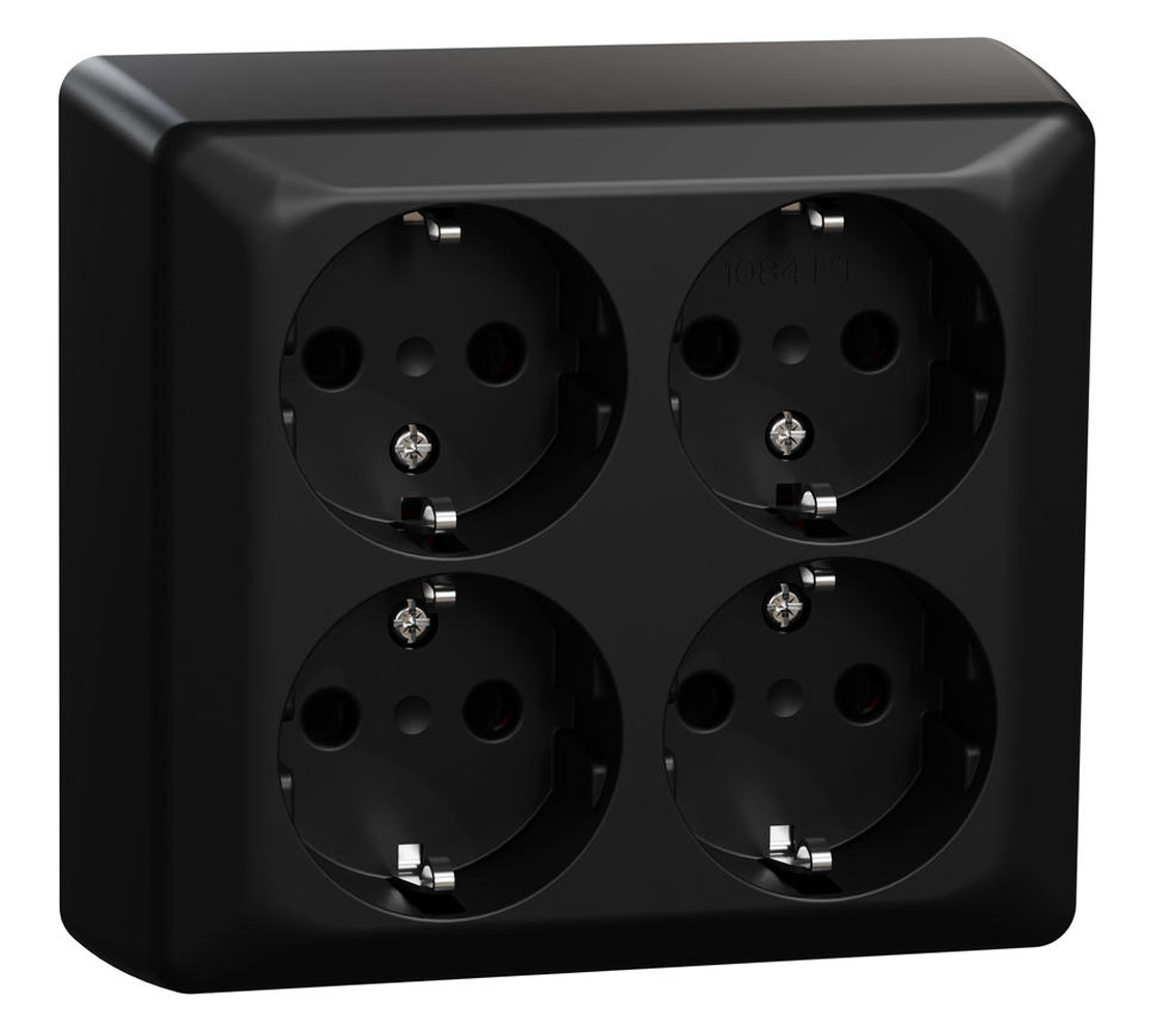 4-vägs mattsvart jordat uttag, utanpåliggande. Sockel, lock och bottenplatta av halogenfri genomfärgad svart termoplast. Dubbla anslutningar per fas. Bottenplattan har ursparingsmarkeringar för 16 mm rör. Plats för två st extra överkopplingsklämmor