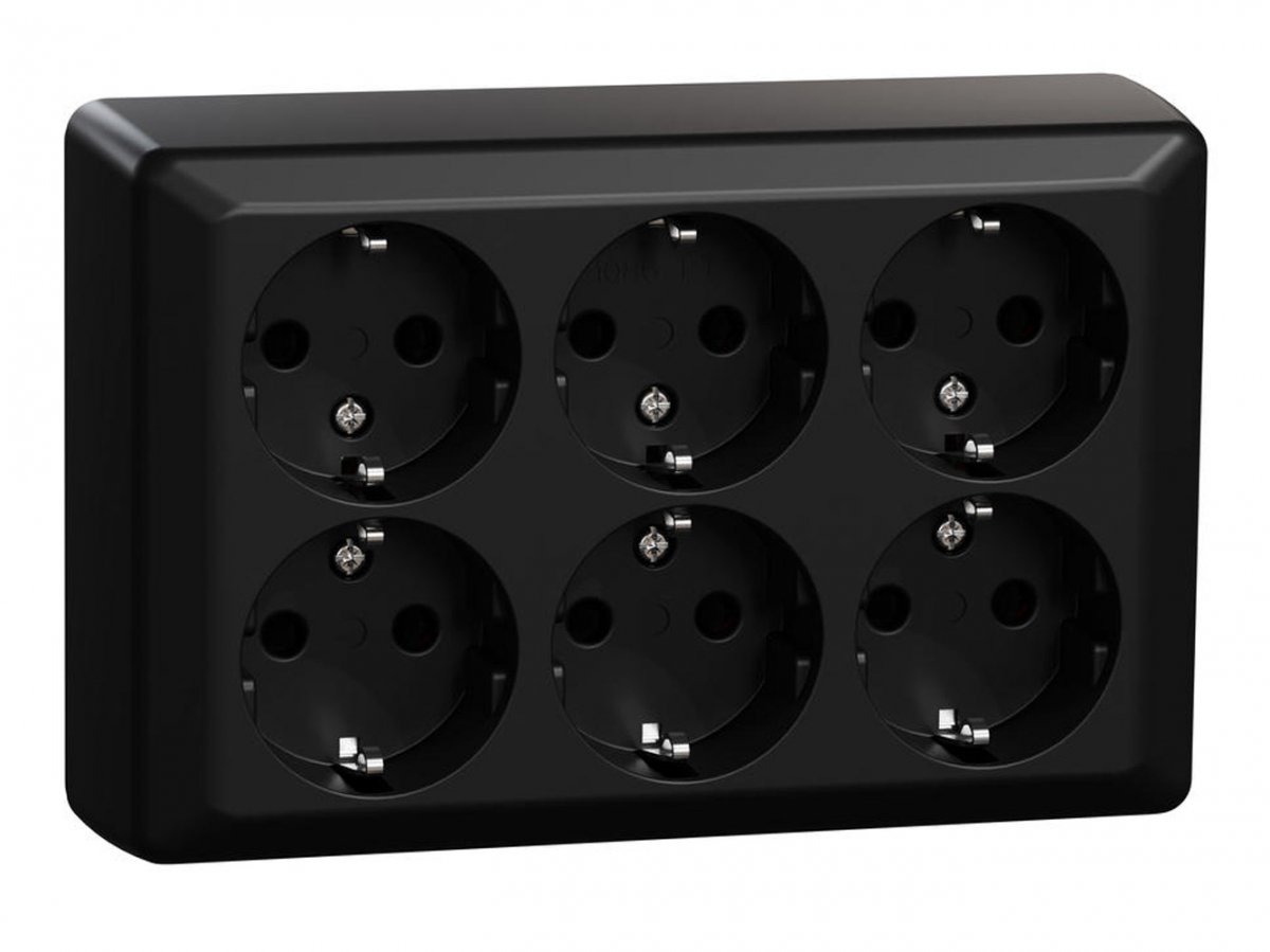 6-vägs mattsvart jordat uttag, utanpåliggande. Sockel, lock och bottenplatta av halogenfri genomfärgad svart termoplast. 3xdubbla Skruv-anslutningar per fas. Bottenplattan har ursparingsmarkeringar för 16 mm rör. Plats för två st extra överkopplingsklämmor