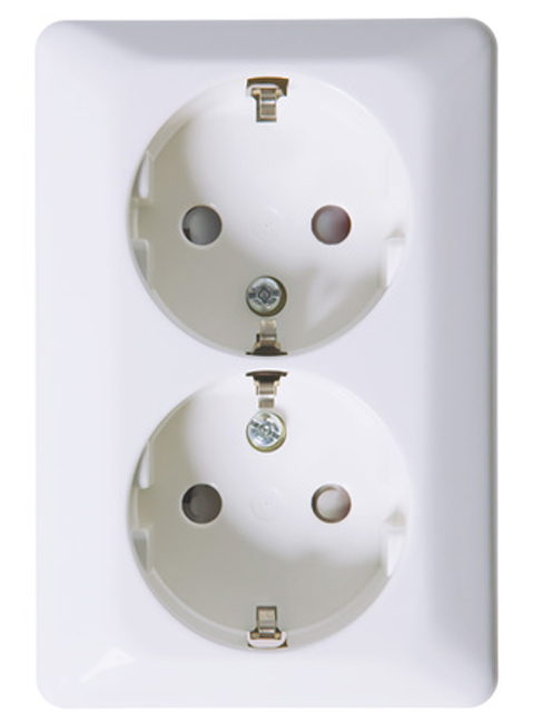 2 Vägguttag för utanpåliggande montage i nya färgen Nordic Renvit RAL 9003. Med jord. Snabb / Skruvtillkoppling av ledarna. Sockel, lock och bottenplatta av halogenfri termoplast. Dubbla anslutningar per fas. Bottenplattan har ursparingsmarkeringar för 16 mm rör.