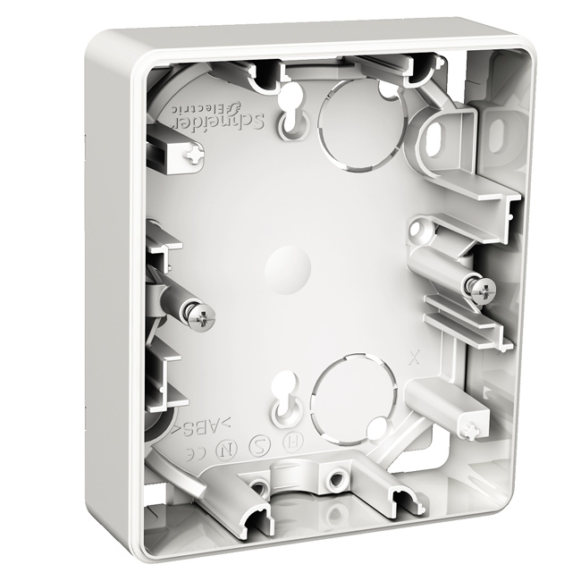 Exxact Dosa för 2-vägsuttag med helkåpa, Primo och Basic med ett invändigt djup på 22mm för utvändigt montage, nyckelhål för montage över apparatdosa. Utbrytningar i bottendel, möjligheter till att montera dragavlastning och skiljevägg. Separat bottendel och förhöjningsram förenklar installationen.