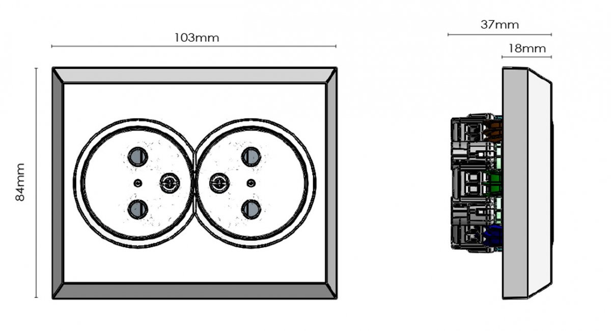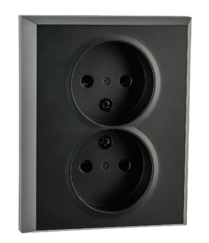 Lågbyggande infällt 2-vägsuttag utan jord, avsedd för insatllationer där jord saknas. Med integrerat petskydd. Sockel, täckplatta och ram av svart halogenfri och färgbeständig polykarbonat.