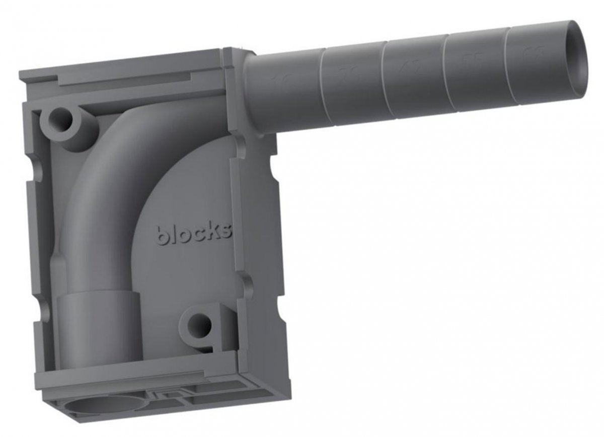 Blocks Rörböj 90° från Elektroskutt till 16mm och 20mm flexrör, detta ger en godkänd elgenomföring i våtutrymmen. Blocks är den utmärkta 90°-böjen. Produkten är enkel att montera med totalt 10 monteringsmöjligheter, 2 olika regelfästen passar,